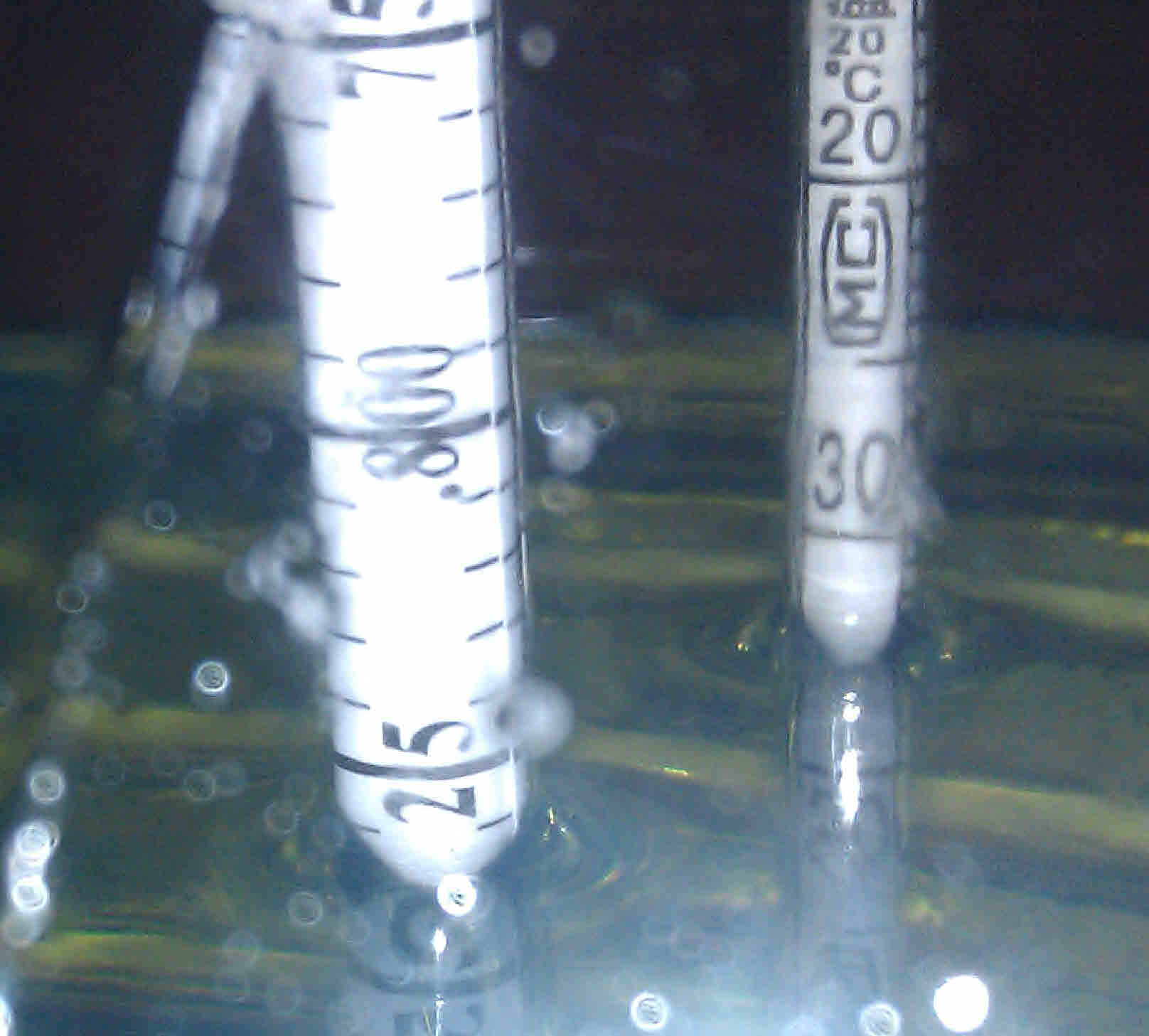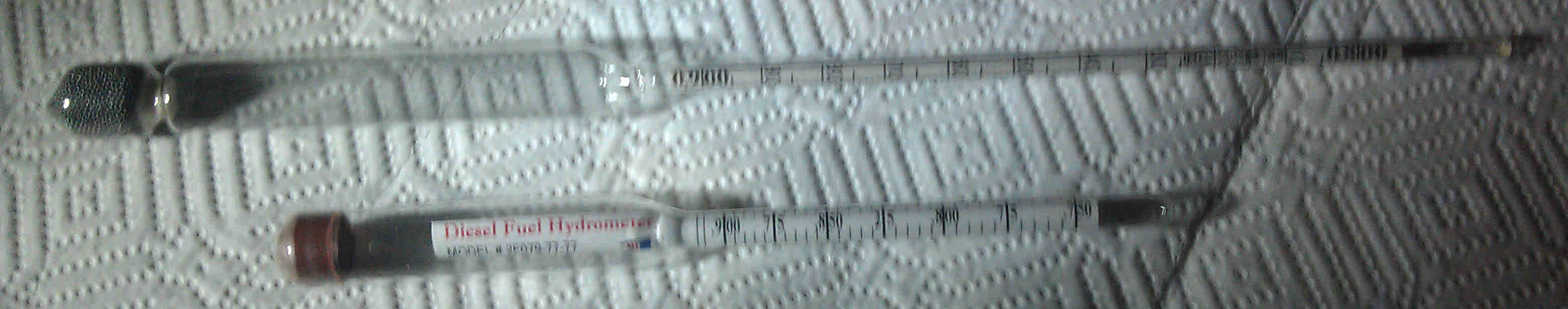 It is hard to get photos of the hydrometer floating in fuel so we took one of them side by side - and on the right is the one that ships with this - showing .831 API - and the other showing essentially the same measurement but is really hard to read because the next graduation mark is just showing at the liquid level which could be .830 or .831 or even .829. - and - this is floating in out of the pump diesel fuel. That is about 43 cetane - at the pump